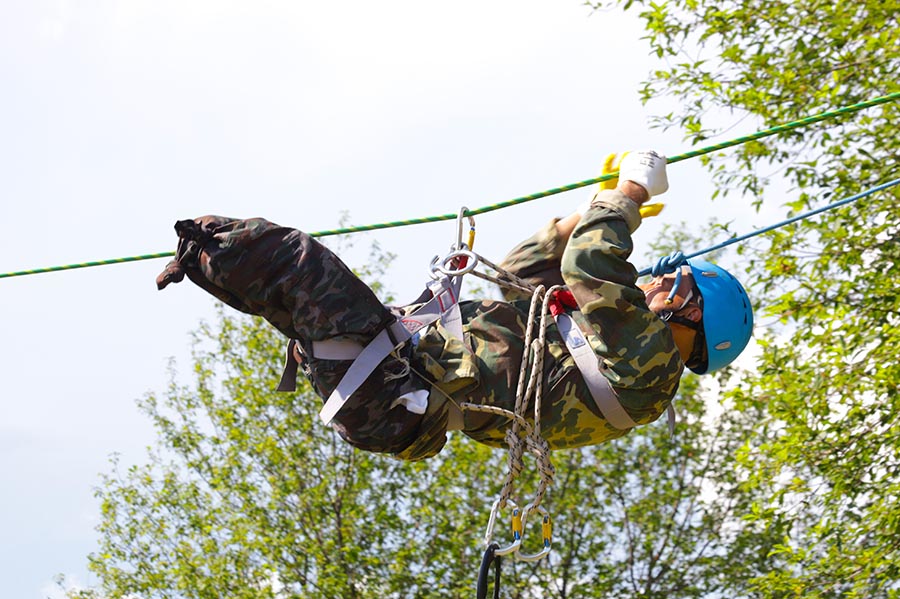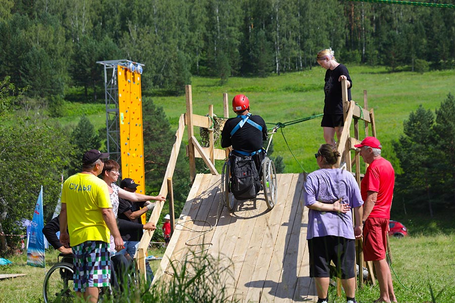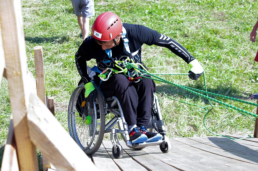 Пешеходная дистанция – класс второй. Четыре этапа. На первом этапе участник поднимает себя на страховке вверх по стволу дерева, на втором – спускается по перилам переправы. Третий этап – подъем, четвертый – спуск на коляске по горке. Протяженность 3 метра, крутизна 30 градусов.