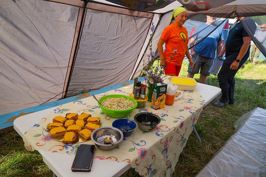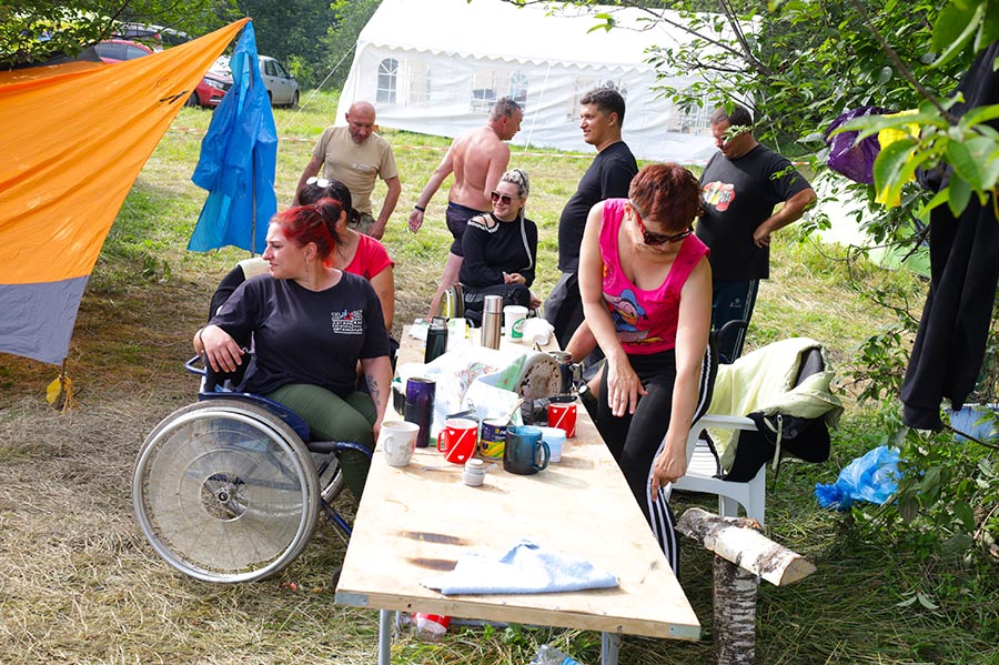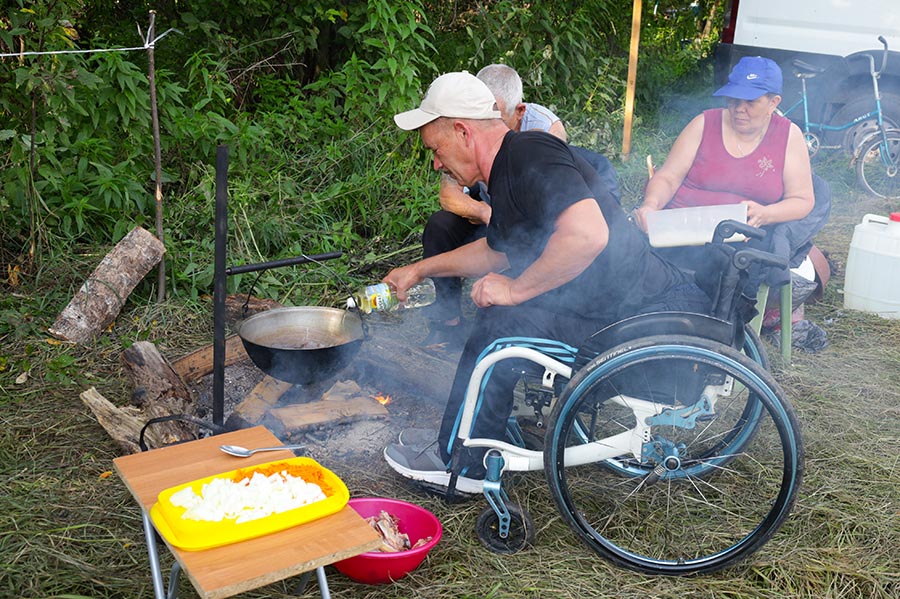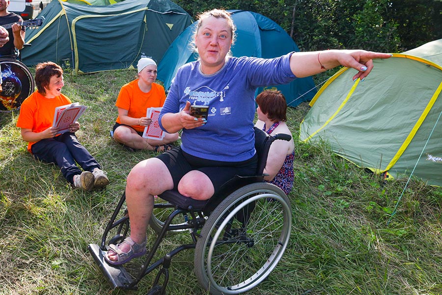 Команда инвалидов по зрению «Луч» встречала песней «Луч солнца золотого...» Стол был накрыт необычными блюдами, но из совершенно обычных продуктов, которые найдутся в рюкзаке каждого туриста. Например, десерт «грибочки»: на печенье выложили творог, а ножкой стала кукурузная палочка. Суши «по туриадски», это когда шарики из риса начиняются рыбой и украшаются ломтиками солёных огурчиков. Шашлык вегетарианский: оливки, сухарики, обжаренные на костре и ломтики маринованных огурчиков. Лагерь был очень красивым, особенно хотелось бы отметить пестрый «волчатник». Ребята сшили его сами, подарив вторую жизнь старым нарядам.