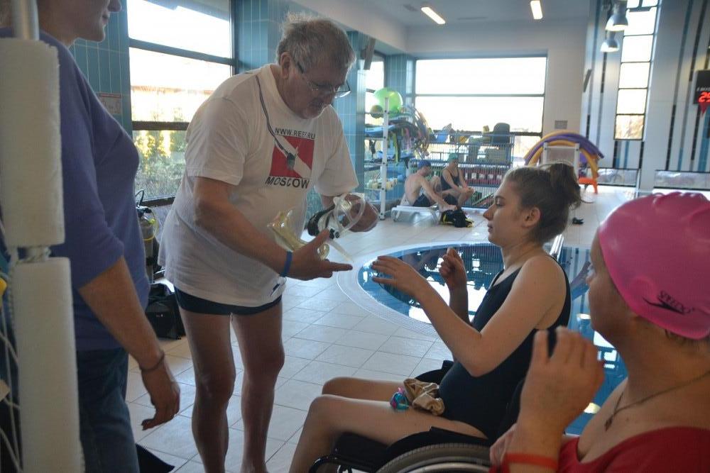 Молодые люди из московского реабилитационного центра «Преодоление» узнали о мастер-классе из соцсетей и загорелись желанием испытать себя. Анастасия Анпилогова учится на факультете бизнеса и менеджмента Высшей школы экономики и ведет блог в интернете. Увидев у одного из корреспондентов фотоаппарат, девушка загорелась идеей фотосессии в бассейне. Поддержать своих друзей из центра «Преодоление» приехала известная общественно-политическая деятельница, обладательница титула «Мисс мира-2013» среди девушек на инвалидных колясках Ксения Безуглова. Ксения также активно участвует во многих, в том числе и самых экстремальных проектах РССИ, прыгает с парашютом, увлекается яхтингом и даже приобщила к гонкам на яхтах, организуемых РССИ, своего мужа.
