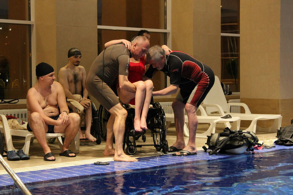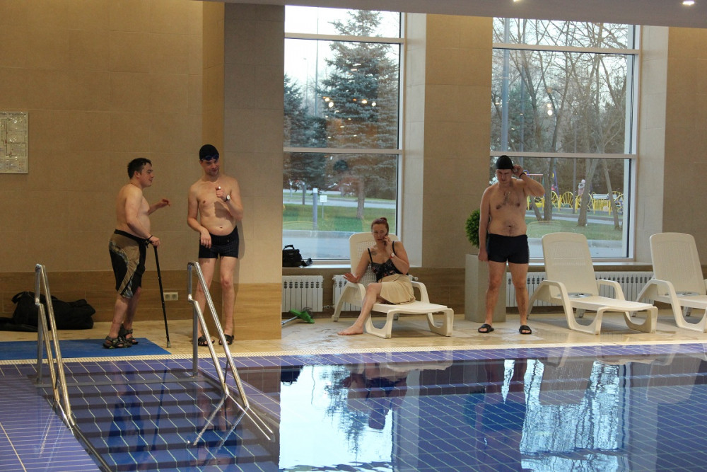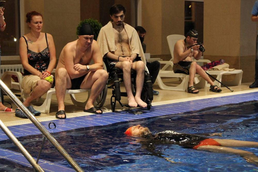 Занятия проходили как в бассейне самого отеля, так и в близлежащем фитнесс-клубе. Основу участников мастер-класса составили спортсмены из московского реабилитационного центра «Преодоление» и калужского физкультурно-спортивного центра «Лидер». Как рассказали калужане, о возможности принять участие в таком потрясающем мероприятии им поведал активист Калужской областной организации ВОИ, участник многих проектов РССИ Арсений Шальнов. Заместитель директора центра «Лидер» по физкультурно-спортивной работе Елена Казакова – сама человек с инвалидностью. Она впервые попробовала погрузиться с аквалангом и испытала на себе особенности фридайвинга. «Впечатления непередаваемые! Стараемся развивать у себя в центре как можно больше спортивных направлений. Участвуем в городских мероприятиях – не только спортивных, но и творческих. Теперь нужно подумать, как продолжить занятия в бассейне в Калуге», – говорит Елена.